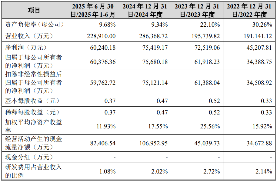 2022年至2025年1-6月,盛龙股份的营业收入分别为191,141.12万元、195,739.82万元、286,368.72万元和228,910.00万元;净利润分别为45,207.81万元、72,519.06万元、75,419.17万元和60,240.18万元;归属于母公司股东的净利润分别为34,388.75万元、61,918.23万元、75,680.18万元和60,376.36万元;扣除非经常性损益后归属于母公司股东的净利润分别为34,508.92万元、61,388.04万元、75,121.14万元和59,762.72万元。