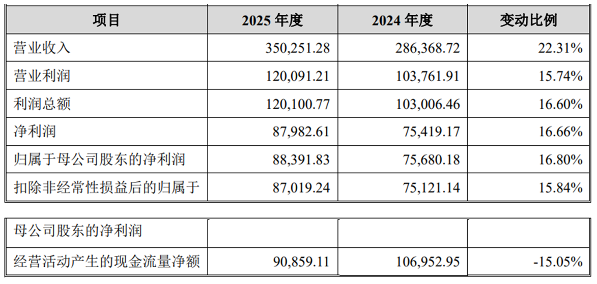 2025年全年,盛龙股份的营业收入为350,251.28万元,同比增长22.31%;净利润为87,982.61万元,同比增长16.66%;归属于母公司股东的净利润为88,391.83万元,同比增长16.80%;扣除非经常性损益后的归属于母公司股东的净利润为87,019.24万元,同比增长15.84%;经营活动产生的现金流量净额为90,859.11万元,同比下降15.05%。