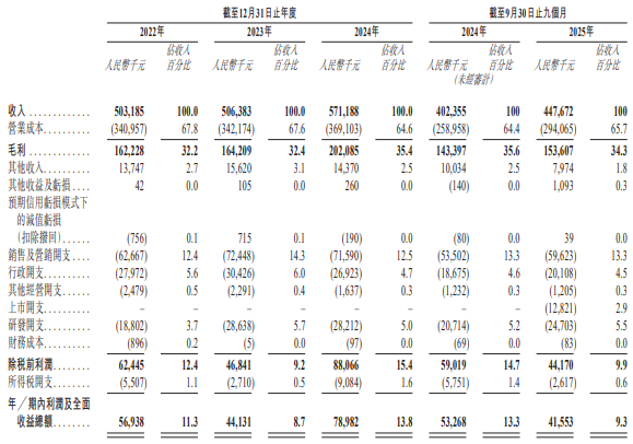 2022年、2023年、2024年、2025年1-9月,铜师傅的收入分别为503.2百万元、506.4百万元、571.2百万元、447.7百万元;年/期内利润及全面收益总额分别为56.9百万元、44.1百万元、79.0百万元、41.6百万元。