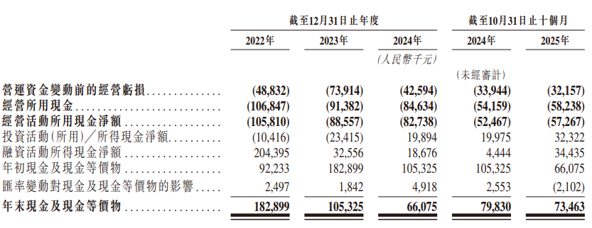 2022年、2023年、2024年、2025年1-10月,公司经营活动所用现金净额分别为-1.06亿元、-8856万元、-8274万元和-5727万元。