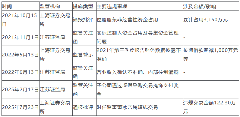 (一)2021年10月15日,上海证券交易所出具《关于对江苏振江新能源装备股份有限公司、控股股东、实际控制人暨时任董事长胡震及有关责任人予以通报批评的决定》(〔2021〕130号);(二)2021年11月1日,中国证券监督管理委员会江苏监管局出具《江苏证监局关于对振江新能源装备股份有限公司的监管关注函》(苏证监函〔2021〕867号);(三)2022年5月13日,上海证券交易所出具《关于对江苏振江新能源装备股份有限公司及有关责任人予以监管警示的决定》(上证公监函〔2022〕0028号);(四)2022年6月13日,中国证券监督管理委员会江苏监管局出具《江苏证监局关于对江苏振江新能源装备股份有限公司的监管关注函》(苏证监函〔2022〕551号);(五)2025年2月17日,中国证券监督管理委员会江苏监管局出具《江苏证监局关于对江苏振江新能源装备股份有限公司的监管关注函》(苏证监函〔2025〕192号);(六)2025年7月23日,上海证券交易所出具《关于对江苏振江新能源装备股份有限公司时任监事董冰予以通报批评的决定》(〔2025〕152号)。