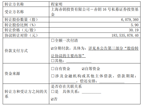 中国经济网北京4月1日讯 兴图新科(688081.SH)昨日发布关于控股股东、实际控制人协议转让部分公司股份暨权益变动的提示性公告。兴图新科控股股东、实际控制人程家明(以下简称“转让方”)与上海赤钥投资有限公司(代表“赤钥16号私募证券投资基金”,以下简称“赤钥基金”或“受让方”)于2026年3月28日共同签署了《股份转让协议》。转让方拟通过协议转让方式向受让方转让其持有的兴图新科6,079,360股股份(占公司总股本的5.90%)(以下简称“标的股份”),转让价格为30.19元/股,股份转让总价款为183,535,878.40元。
