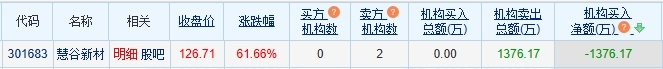 龙虎榜数据显示,今日,卖出慧谷新材金额最大的前五名中,2家为机构专用席位。经统计,机构席位今日卖出慧谷新材净额为1376.17万元。