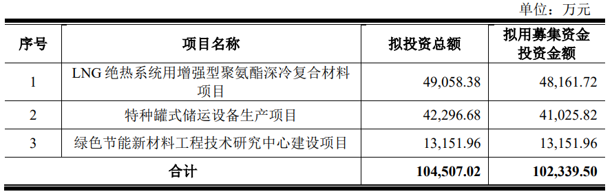 四方科技本次发行可转换公司债券拟募集资金总额不超过人民币102,339.50万元(含本数),扣除发行费用后将用于“LNG绝热系统用增强型聚氨酯深冷复合材料项目”“特种罐式储运设备生产项目”和“绿色节能新材料工程技术研究中心建设项目”。