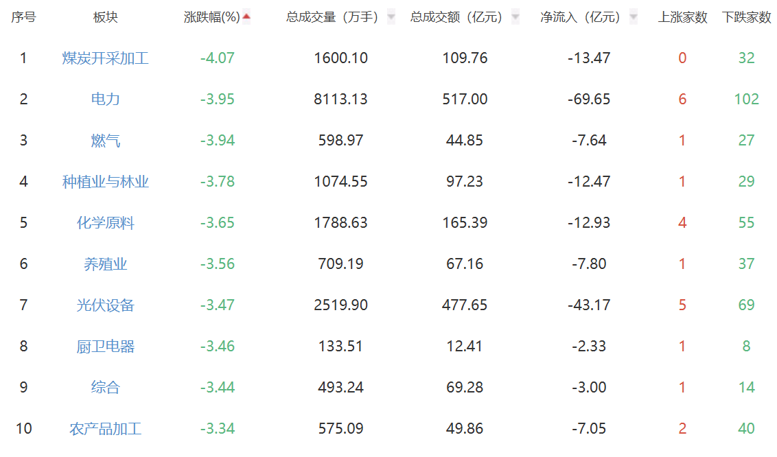 行业板块方面,通信设备、电子化学品板块上涨,煤炭开采加工、电力、燃气等板块跌幅居前。