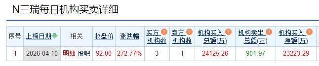 龙虎榜数据显示,买入三瑞智能金额最大的前五名中,有3家机构专用席位;卖出三瑞智能金额最大的前五名中,有1家机构专用席位。经统计,机构席位今日买入三瑞智能净额为23223.29万元。