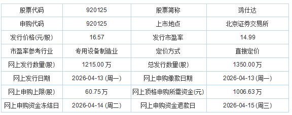 鸿仕达2026年4月9日披露的向不特定合格投资者公开发行股票并在北京证券交易所上市发行公告显示,若本次发行成功,预计公司募集资金总额为22,369.50万元,扣除发行费用2,949.07万元(不含增值税)后,预计募集资金净额为19,420.43万元。