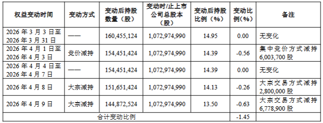 其中,新银国际于2026年4月1日至4月3日通过集中竞价方式减持6,003,700股;于2026年4月8日通过大宗交易方式减持2,800,000股;于2026年4月9日通过大宗交易方式减持6,778,900股。