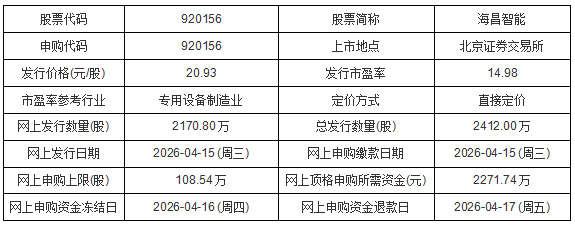 海昌智能2026年4月13日披露的向不特定合格投资者公开发行股票并在北京证券交易所上市发行公告显示,若本次发行成功,预计公司募集资金总额为50,483.16万元,扣除发行费用5,293.79万元(不含增值税)后,预计募集资金净额为45,189.37万元(如存在尾数差异,为四舍五入造成)。