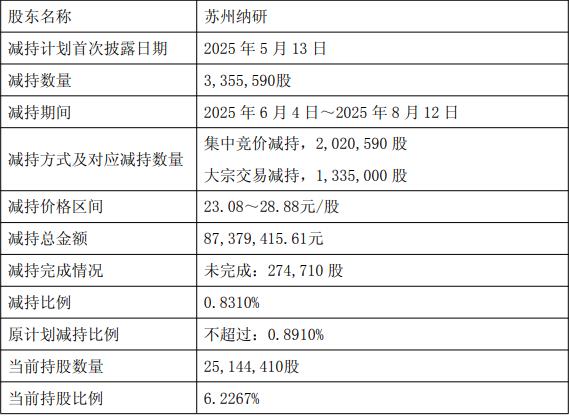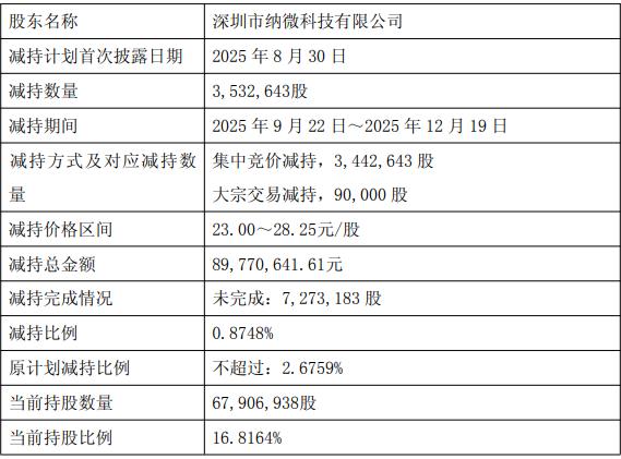 2025年12月19日,公司收到股东陈荣华及深圳纳微发来的告知函,陈荣华通过深圳纳微以集中竞价及大宗交易方式累计减持公司股份3,532,643股,占公司总股本比例为0.8748%。截至公告披露日,本次减持计划已实施完毕。本次减持套现89,770,641.61元。
