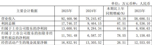 据公司2025年年报,2025年,公司实现营业收入9.25亿元,同比增长18.18%;公司实现归属于母公司所有者的净利润1.36亿元,同比增长64.18%;实现归属于母公司所有者的扣除非经常性损益的净利润1.18亿元,同比增长78.55%;经营活动产生的现金流量净额1.68亿元。