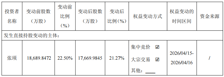 具体来看,2026年4月15日至 2026年4月16日,张顼通过集中竞价和大宗交易方式合计减持1019.8627万股份。按照减持期间加权均价13.91元计算,张顼套现约1.42亿元。