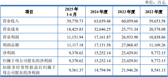 2022年、2023年、2024年、2025年1-6月,公司营业收入分别为39,653.58万元、60,059.66万元、63,659.48万元和39,770.73万元;净利润分别为9,772.15万元、23,429.01万元、15,252.14万元和9,370.62万元;扣除非经常性损益后归属于母公司股东的净利润分别为8,541.13万元、21,946.26万元、14,794.94万元和9,361.37万元。