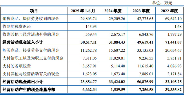 报告期内,公司销售商品、提供劳务收到的现金分别为69,642.10万元、42,775.65万元、29,209.26万元和29,803.74万元;经营活动产生的现金流量净额分别为39,335.82万元、-7,256.58万元、-1,539.59万元和6,662.34万元。