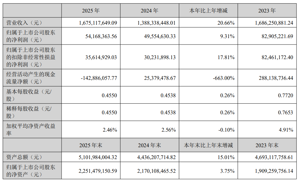 2025年,翔丰华实现营业收入167,511.76万元,较上年同期增长20.66%;实现归属于上市公司股东的净利润5,416.84万元,同比增长9.31%;实现归属于上市公司股东的扣除非经常性损益的净利润3,561.49万元,同比增长17.81%;经营活动产生的现金流量净额为-14,288.61万元,上年同期为2,537.95万元。