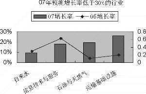 2007年预测增长率低于30%的行业有预测增长率分别为自来水、信息技术与服务、石油与天然气、运输基础设施。(详见图4)。