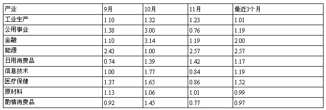 对除了通讯服务产业外的其它9个产业,我们在每个月底分别统计了1个月的盈利预测调整比率和3个月的盈利预测调整比率。1(或3)个月的盈利预测调整比率为1(或3)个月内盈利预测上调数量除以1(或3)个月内盈利预测下调数量。