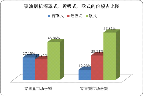 深罩式的下滑,近吸式的提升,均未能动摇欧式吸油烟机的市场主流地位。CMM数据显示,在城市吸油烟机市场,欧式吸油烟机的零售量市场份额高达45.86%,零售额份额高达57.31%。虽与去年同期相比略有下降,仍然控制着半壁江山,成为高端市场主流。