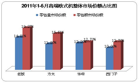 数据还显示,2011年5月,吸油烟机市场前十大畅销型号的份额越来越集中,总共划走全部市场16.62%的零售量份额。十大畅销型号由五大品牌瓜分,其中老板与方太各3款,华帝2款,万和与美的各1款。具体到欧式吸油烟机5月份前十位畅销机型,老板、华帝各3款,方太2款,美的和万家乐各1款。近吸式5月份前十位畅销机型,老板、美的各2款,方太、帅康、华帝、海尔、万喜、万和各1款。